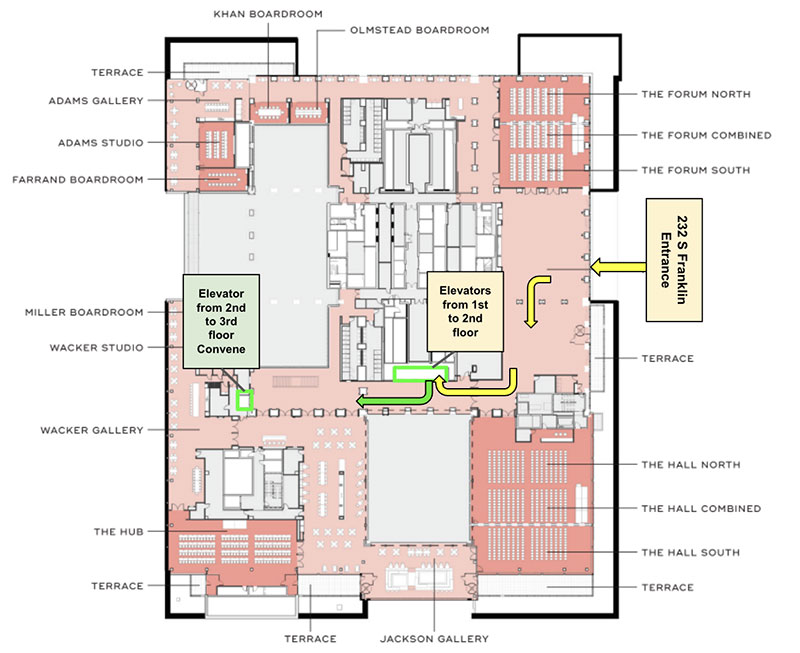 To access Convene from the Franklin Entrance, please head to the left of the Security Desk, toward the Catalog Food Court, where you can take the stairs or the main elevators up one level to Floor 2 (Wacker Lobby). On the 2nd floor, you will see a drop down sign for Convene next to a large stairwell that leads to our 3rd floor event space. There is also an elevator behind our stairwell as another point of entry to the event floor.